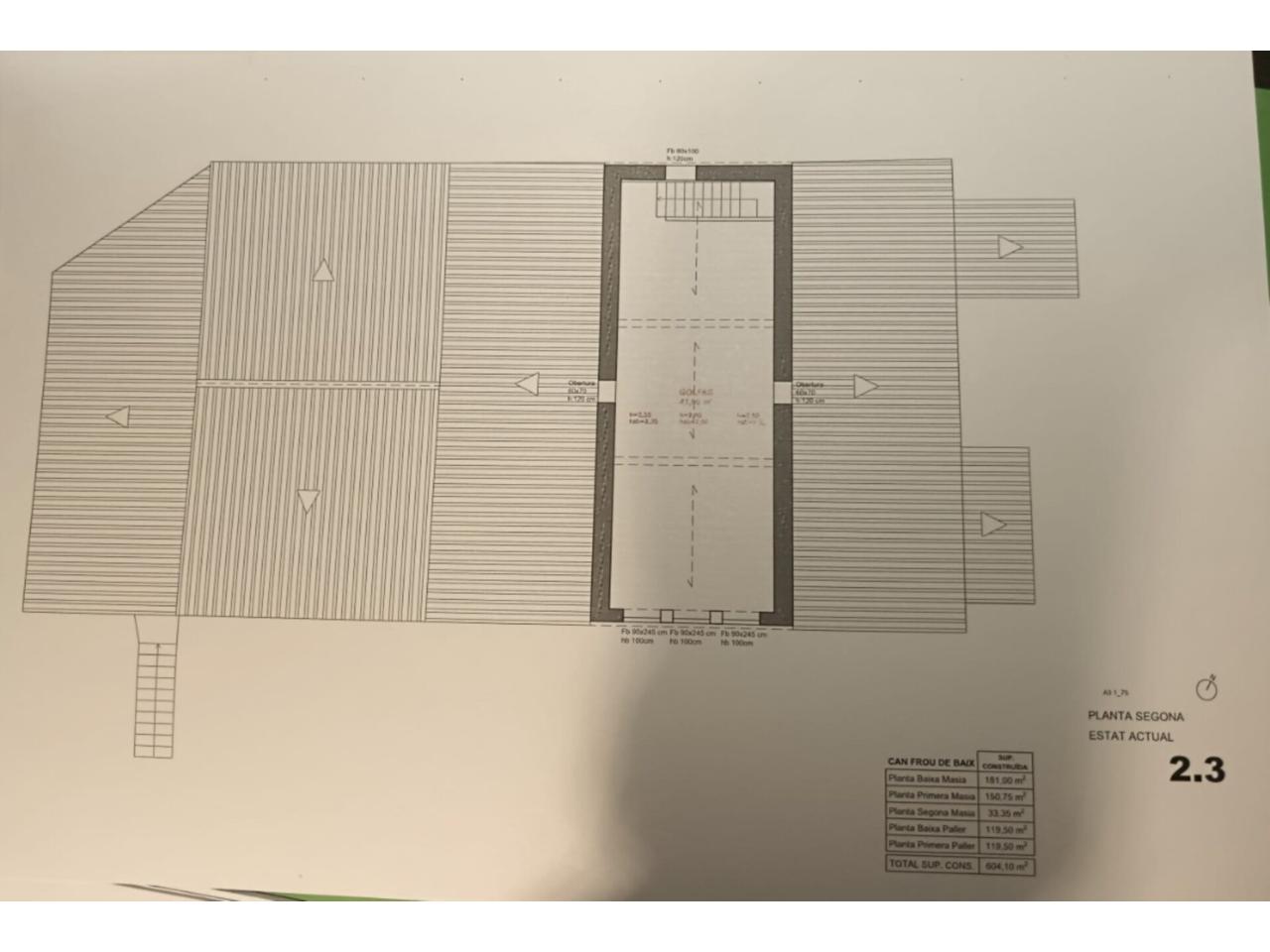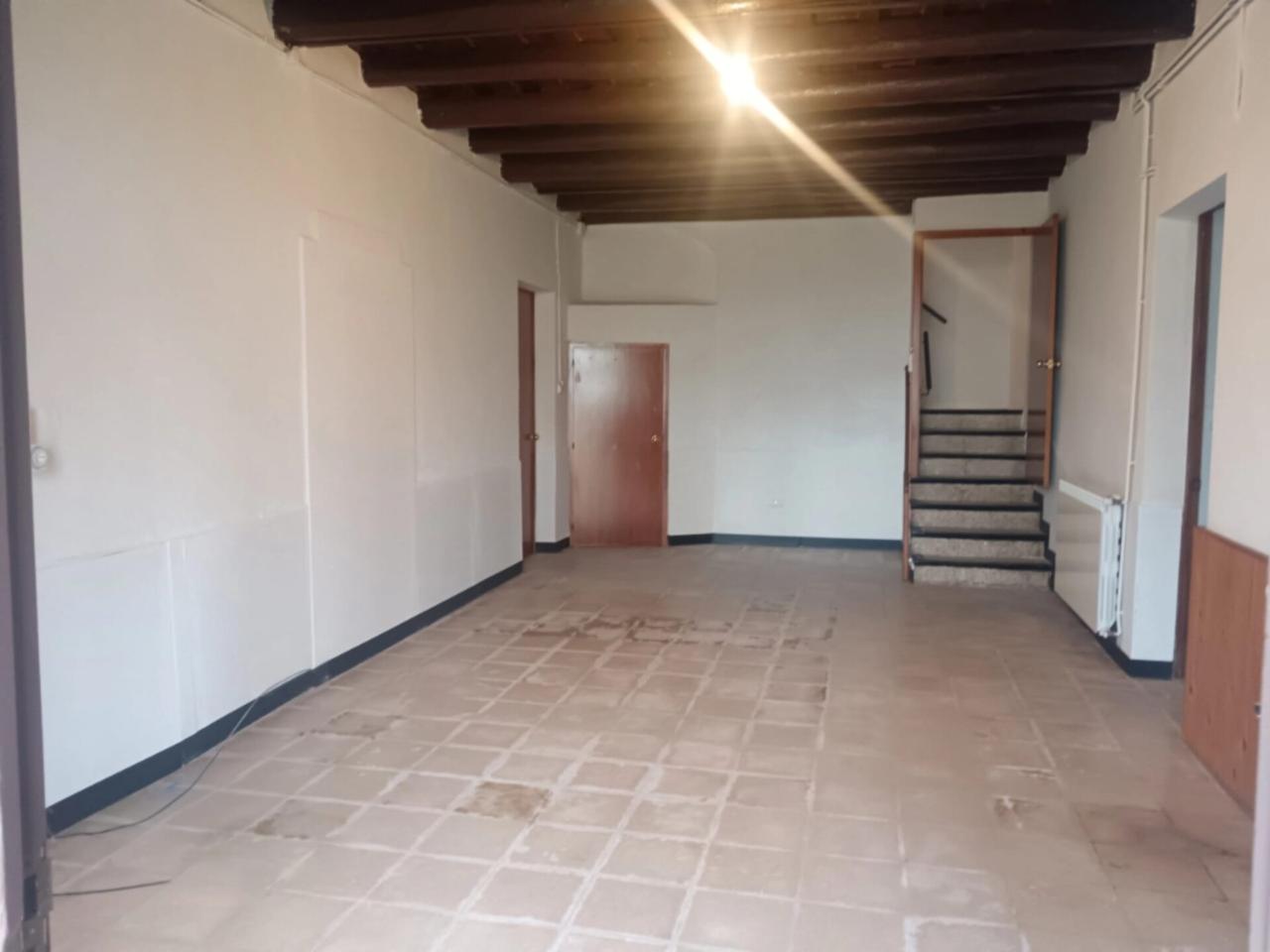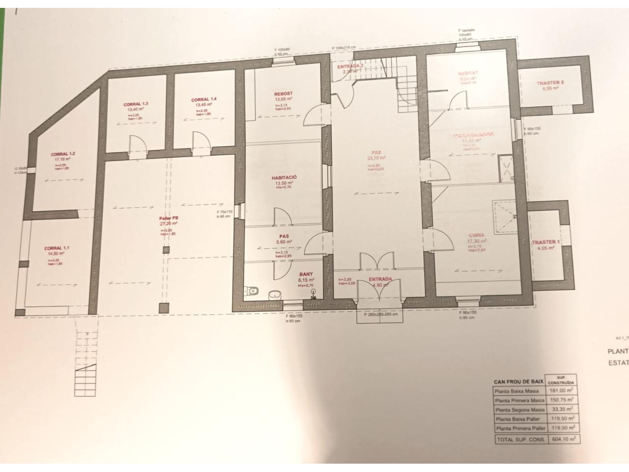 P.B.: 120 m² Entrant a la finca trobem una gran sala que distribueix la planta baixa amb cuina office amb xemeneia. 3 hab. o Saletes, (1 amb xemeneia) + 1 hab. actualitzada amb bany complert, que es va adaptar pels antics llogaters. Des de la sala principal tenim porta d'accés a traster i accés per escales a la planta 1a.